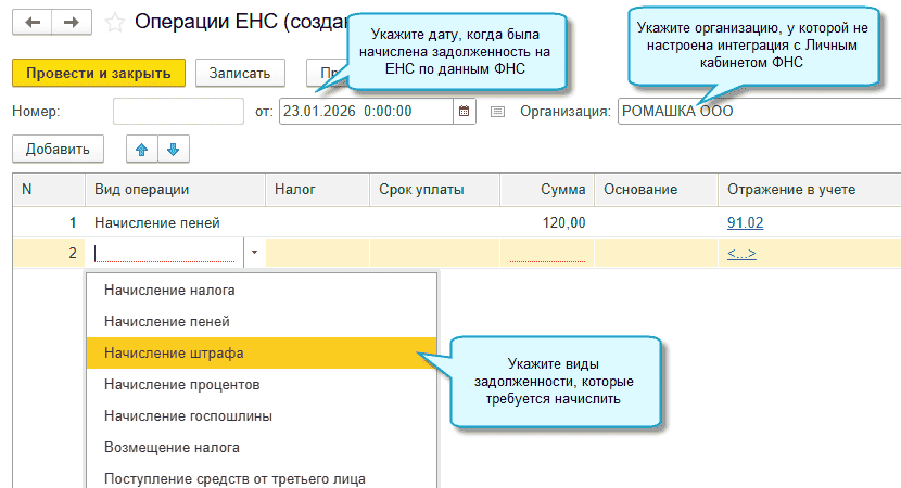 В организациях, у которых настроена интеграция с Личным кабинетом ФНС, этим документом автоматически отражаются все начисления на ЕНС по данным ФНС.