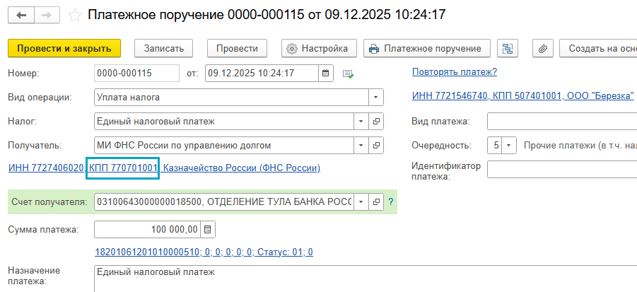 В программе «1С:Бухгалтерия 8» начиная с версии 3.0.188.22 с 05.12.2025 в платежных получениях на уплату единого налогового платежа для Казначейства России заполняется КПП 770701001.