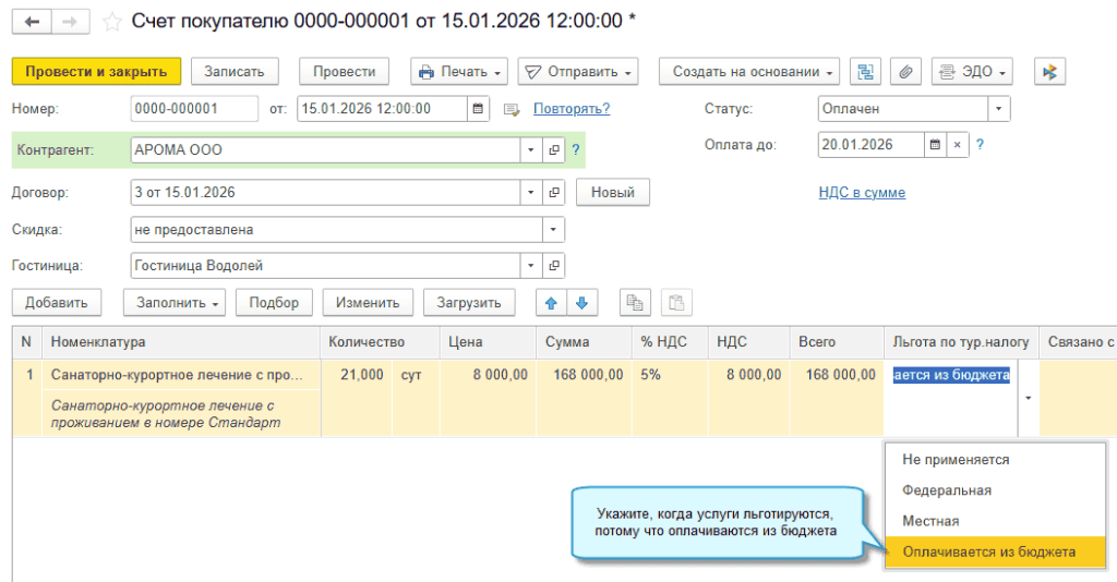 В программе «1С:Бухгалтерия 8» начиная с версии 3.0.188 добавлена возможность рассчитать туристический налог с учетом льготы, предоставляемой при оплате услуг по проживанию из бюджета (Федеральный закон от 28.11.2025 № 425-ФЗ).