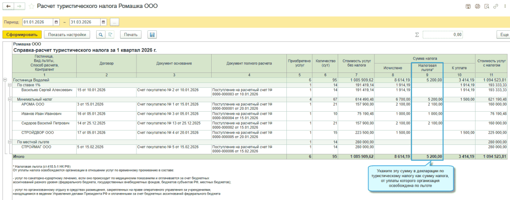 Аналогично льгота указывается в документах Розничная продажа (чек), Отчет о розничных продажах, Начисление туристического налога.