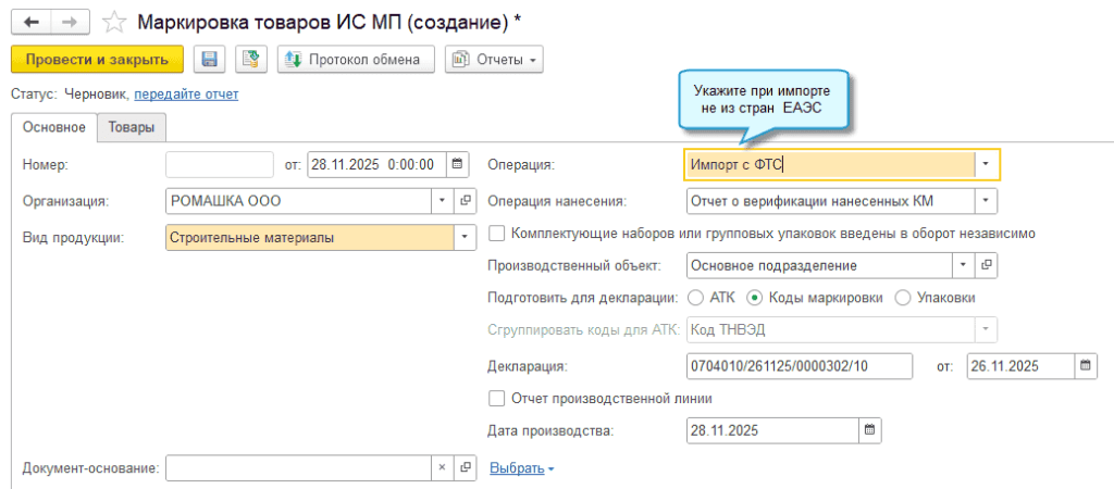 В программе «1С:Бухгалтерия 8» начиная с версии 3.0.188 добавлена возможность маркировки товаров из группы Строительные материалы с операцией «Импорт с ФТС». В ходе маркировки можно подготовить коды для таможенной декларации на товары, исключив таким образом расхождение данных ФТС и ГИС МТ по кодам идентификации. Подробнее на примере молочной продукции см. здесь.