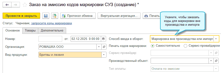 В программе «1С:Бухгалтерия 8» начиная с версии 3.0.188 добавлена возможность заказать коды маркировки со способом ввода в оборот «Маркировка вне производства или импорта» для товарных групп: