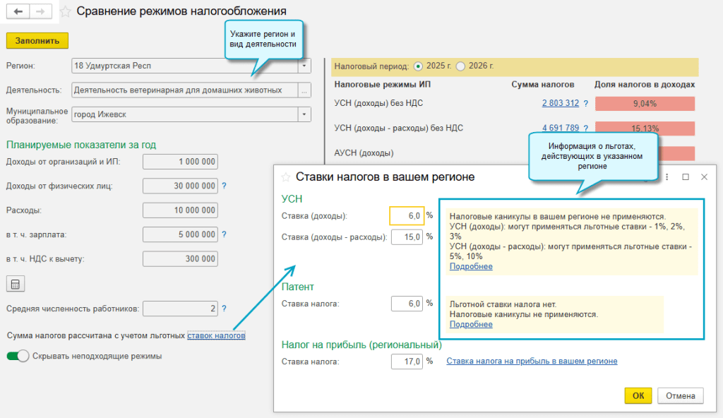 В программе «1С:Бухгалтерия 8» начиная с версии 3.0.177 теперь в сравнении режимов налогообложения показываются варианты налоговых льгот по УСН и патенту в указанном регионе. Можно сразу ознакомиться с условиями применения льгот и применить льготные ставки в расчете суммы налога, если они выполняются.