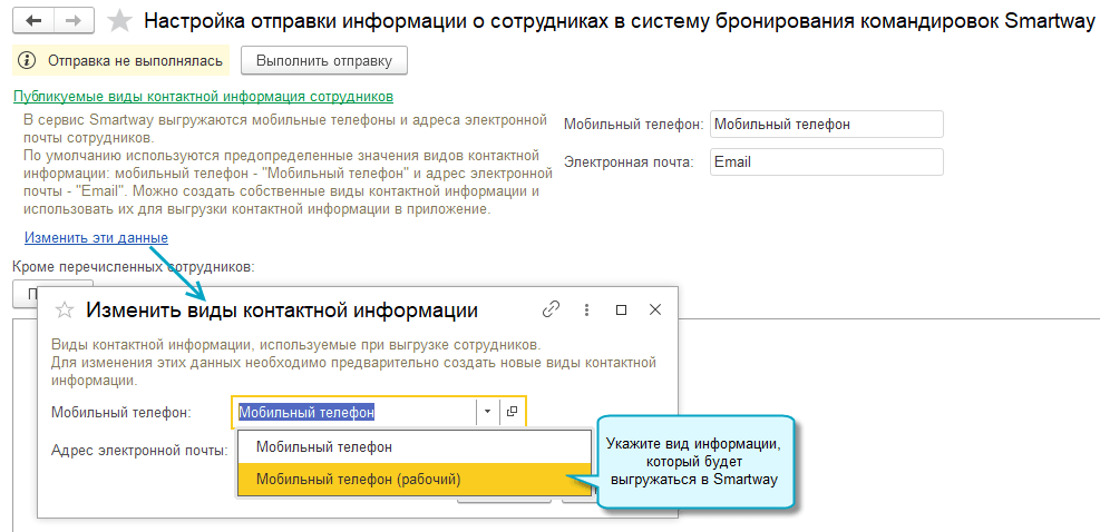 Добавьте свои виды контактной информации (e-mail и мобильный телефон) для карточек сотрудников, чтобы потом указать их для выгрузки в Smartway.