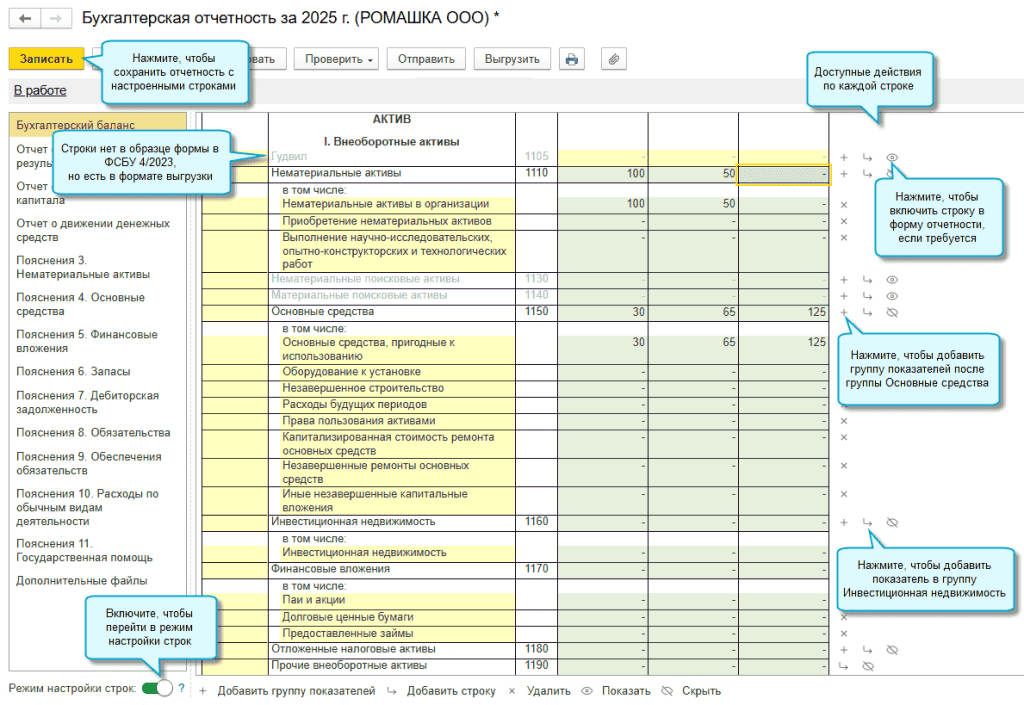Функционал доступен начиная с отчетности за 2025 год для форм полной бухгалтерской отчетности, утвержденной приказом Минфина России от 04.10.2023 № 157н в редакции приказа Минфина России от 07.11.2025 № 159н.
