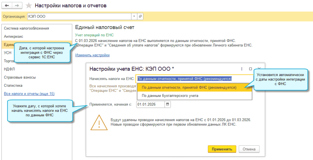 Добавлена возможность начать вести учет ЕНС по данным ФНС с даты более ранней, чем настроена интеграция с ФНС через сервис 1С:ЕНС. Например, когда сервис 1С:ЕНС подключен 01.03.2026, загрузить операции по ЕНС по данным ФНС начиная с 01.01.2026.
