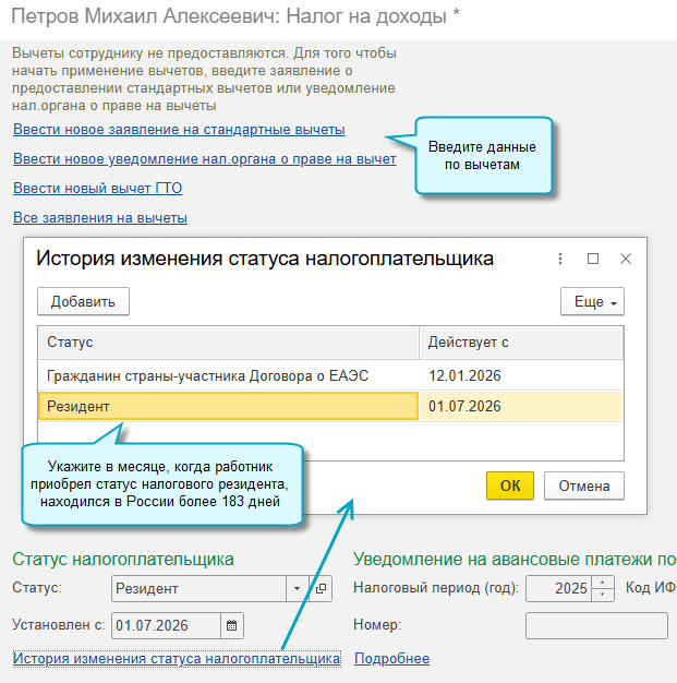 - вычеты предоставляются только при получении статуса Резидент (Федеральный закон от 28.11.2025 №425-ФЗ).