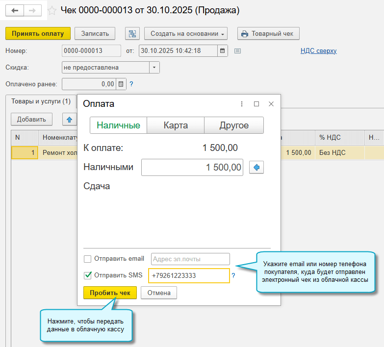 Чтобы использовать облачную кассу, подключите сервис 1С-Облачная касса. Потом выполните настройку подключения кассы в программе.