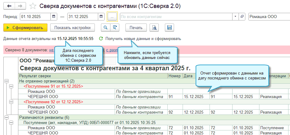 В программе «1С:Бухгалтерия 8» начиная с версии 3.0.189 отчеты по сверке документов с контрагентами открываются теперь с данными на дату последнего обмена с сервисом 1С:Сверка 2.0. Добавлена возможность запустить обмен, если нужны более свежие данные.