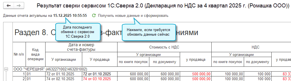 Аналогично работают отчеты по сверке счетов-фактур по декларации по НДС.