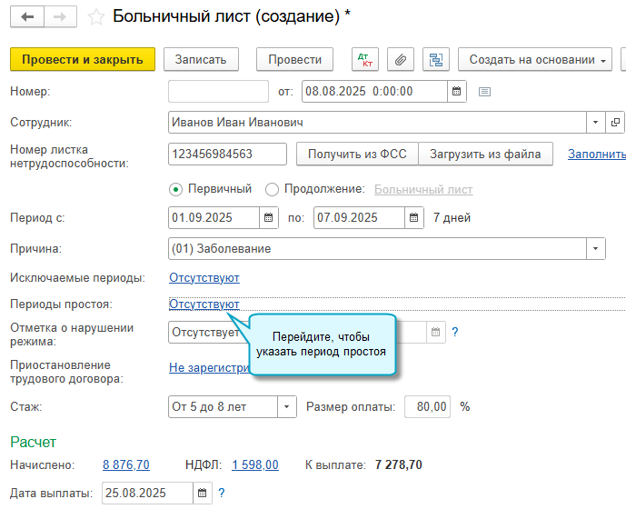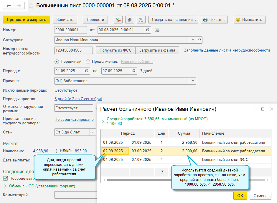 В программе «1С:Бухгалтерия 8» начиная с версии 3.0.183 добавлен расчет больничных за счет работодателя, когда период временной нетрудоспособности пересекается с простоем (пункт 7 статьи 7 Федерального закона от 29.12.2006 №255-ФЗ).