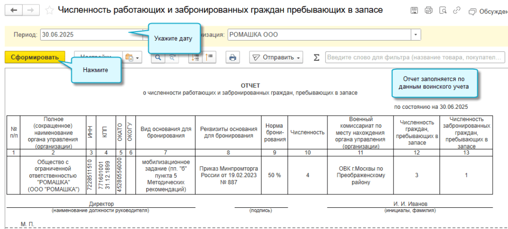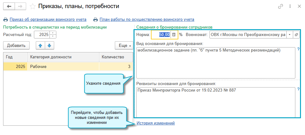 Для его заполнения потребуется внести данные о норме бронирования, военкомате по месту нахождения организации и основании бронирования.