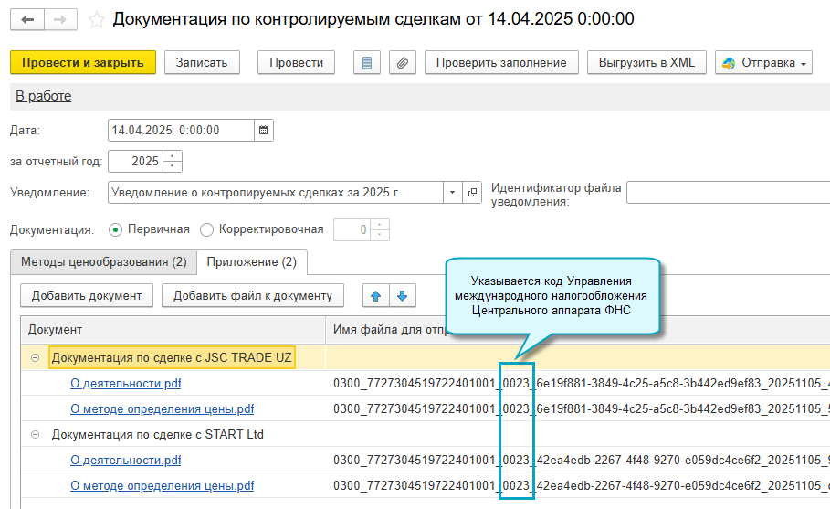 В программе «1С:Бухгалтерия 8» начиная с версии 3.0.194.23 документация по контролируемым сделкам теперь выгружается и отправляется в Управление международного налогообложения Центрального аппарата ФНС РФ с кодом налогового органа 0023 (письмо ФНС от 20.01.2026 №13-4-03/0001@).