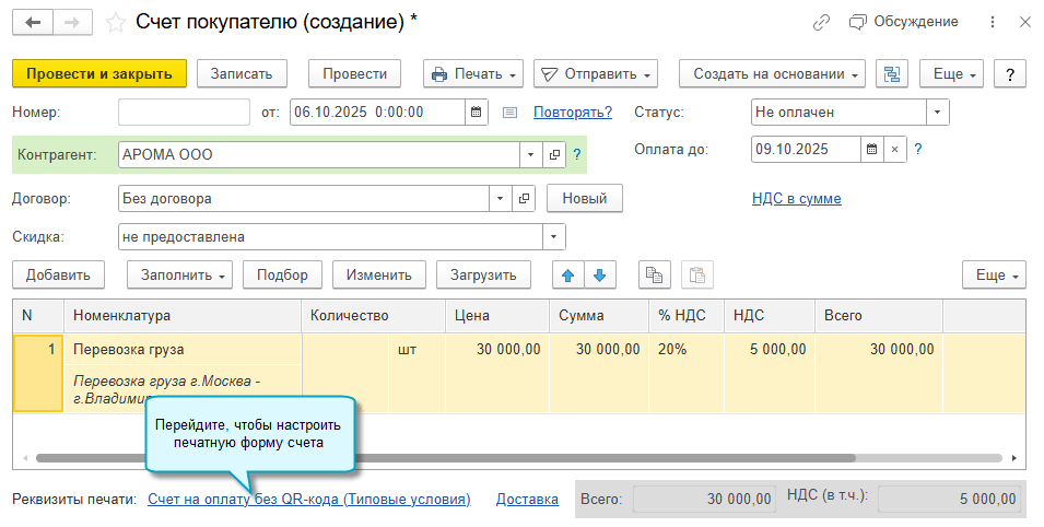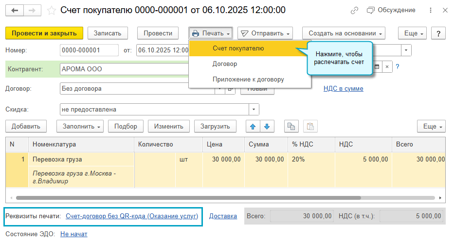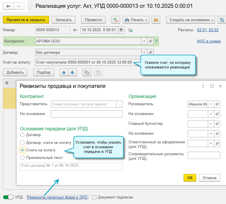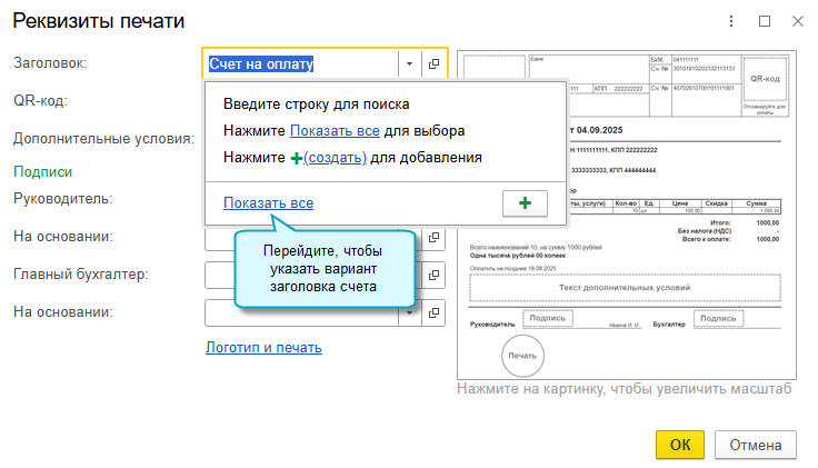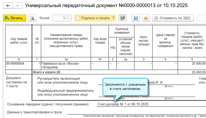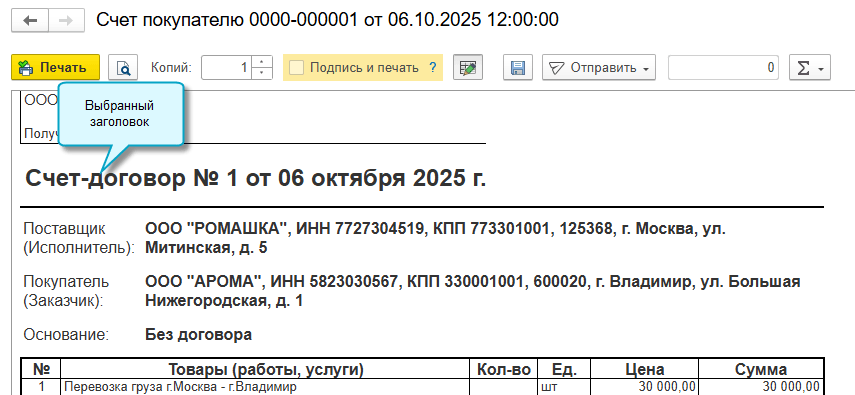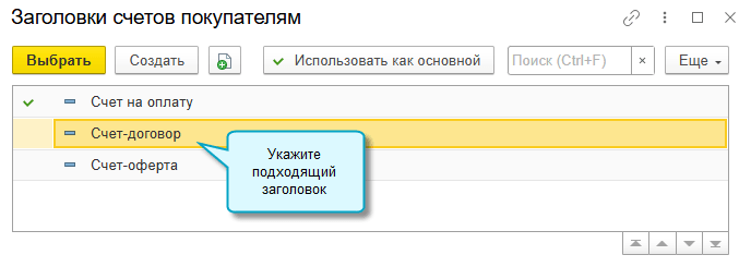 В программе «1С:Бухгалтерия 8» начиная с версии 3.0.185 добавлена возможность указать, с каким заголовком распечатать счет покупателю: счет на оплату, счет-оферта, счет-договор или другой вариант. Выбранный заголовок заполняется потом в УПД в основании передачи, если в нем требуется указать счет.
