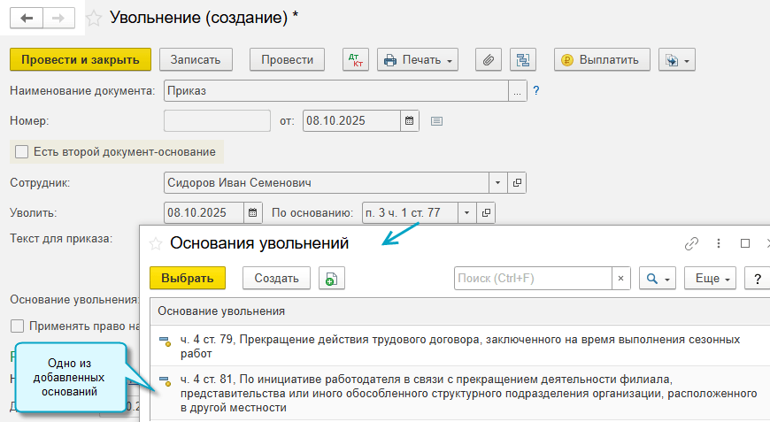 В программе «1С:Бухгалтерия 8» начиная с версии 3.0.185 в перечень оснований увольнения добавлены пункты и статьи:
