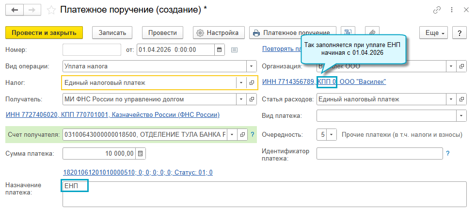 В программе «1С:Бухгалтерия 8» начиная с версии 3.0.194.23 с 01.04.2026 в платежном поручении на уплату единого налогового платежа в назначении платежа указывается «ЕНП», вместо КПП организации указывается «0» (приказ Минфина России от 16.05.2025 №58н).