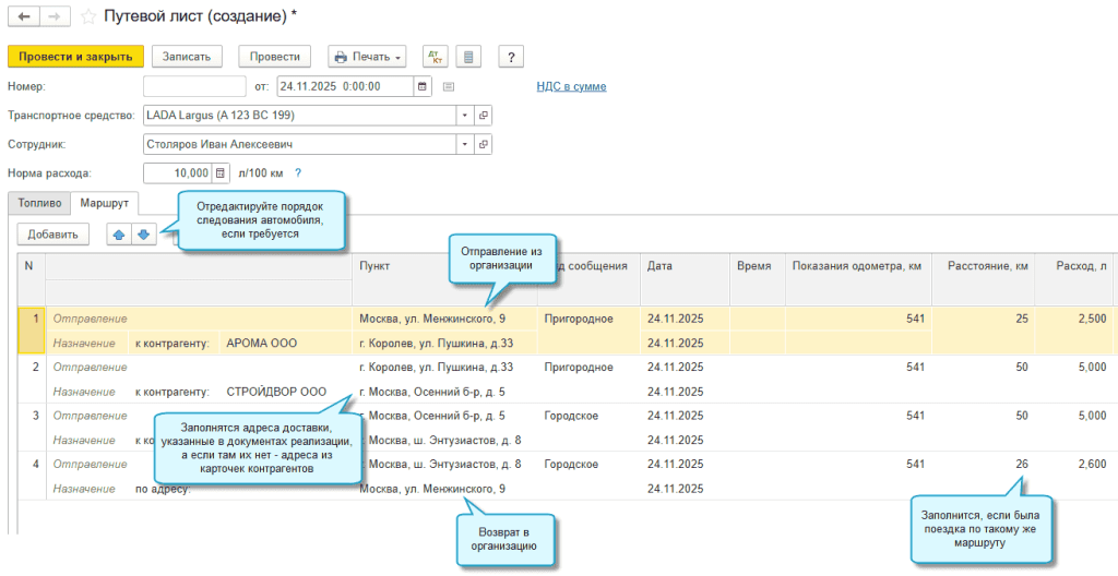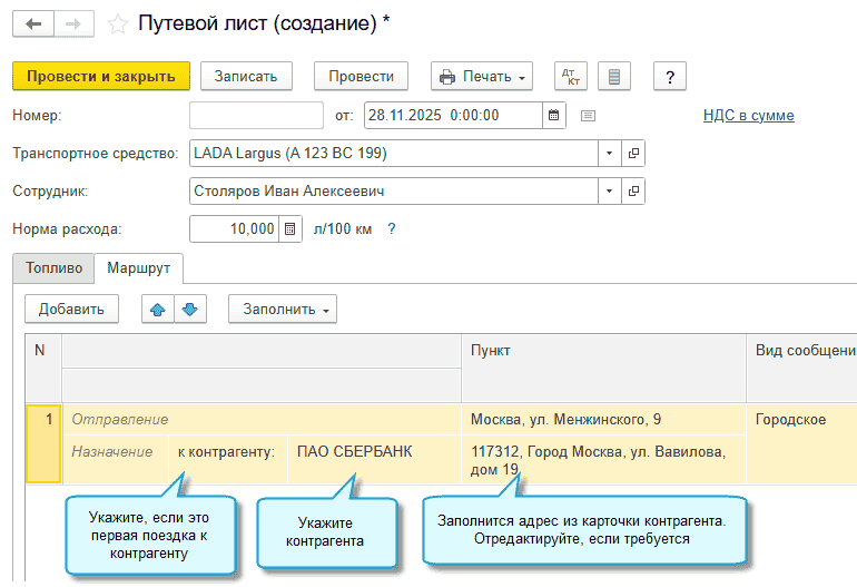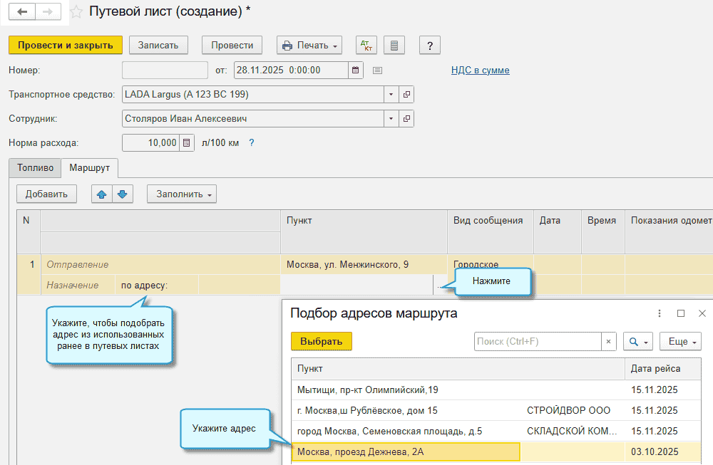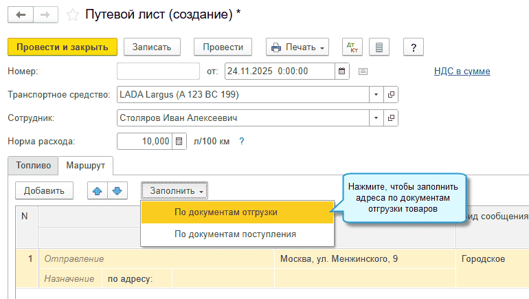 В программе «1С:Бухгалтерия 8» начиная с версии 3.0.188 добавлена возможность подбирать адреса отправления и назначения в путевых листах: