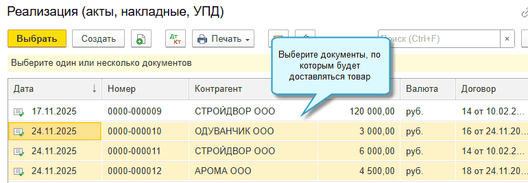 Полный интерфейс: меню «Покупки – Покупки – Путевые листы».