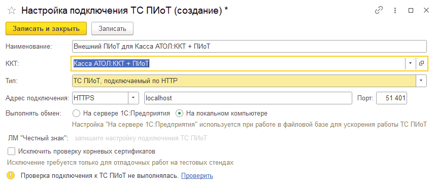 Поддерживается ТС ПИоТ, подключаемый по HTTP. Для настройки укажите протокол, адрес подключения и порт. Эти данные должны соответствовать настройкам внешнего ПО ТС ПИоТ. Обмен с ТС ПИоТ может производиться на локальном компьютере или на сервере 1С:Предприятие (доступно в клиент-серверной архитектуре).