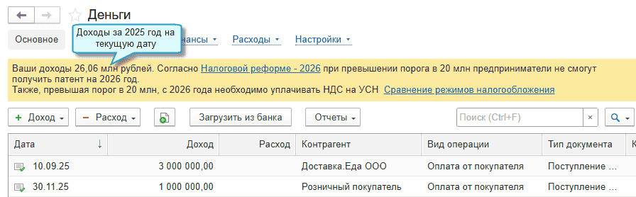 В программе «1С:Бухгалтерия 8» начиная с версии 3.0.188 добавлено предупреждение о приближении к порогу применения патента и УСН без НДС с 2026 года (Федеральный закон от 28.11.2025 № 425-ФЗ).