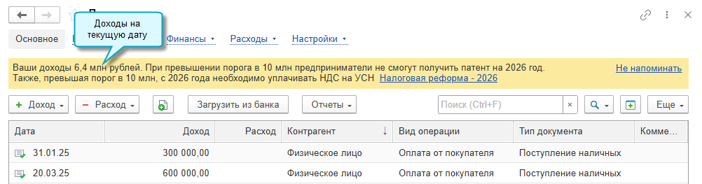 В программе «1С:Бухгалтерия 8» начиная с версии 3.0.184.21 добавлено предупреждение о приближении к планируемому порогу применения патента и УСН без НДС с 2026 года.