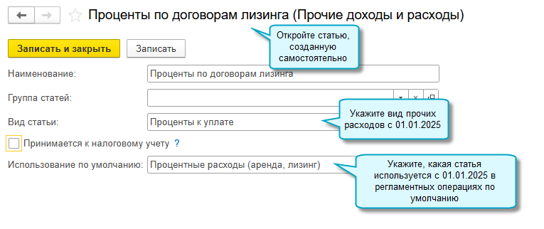 Статья «Проценты к получению, уплате» при обновлении переименовывается в «Проценты к получению, уплате (до 2025 г.)». Не рекомендуется с 01.01.2025 использовать ее и другие статьи, созданные пользователем, с видом прочих доходов и расходов «Проценты к получению (уплате)».