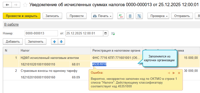 Проверка также выполняется при заполнении формы 6-НДФЛ и уведомления об исчисленных суммах налогов в части сумм НДФЛ.