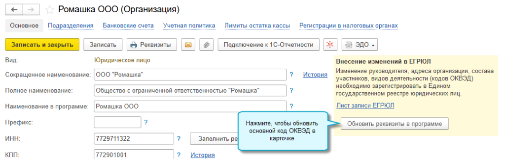 Если сервис 1С-Отчетность не подключен, измените самостоятельно код ОКВЭД в карточке организации после изменения данных в ЕГРЮЛ или ЕГРИП.