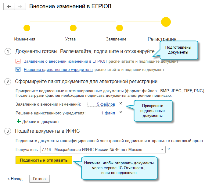 После отправки заявления в ФНС через 1С-Отчетность, отслеживайте результат в карточке организации.