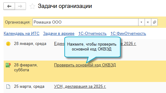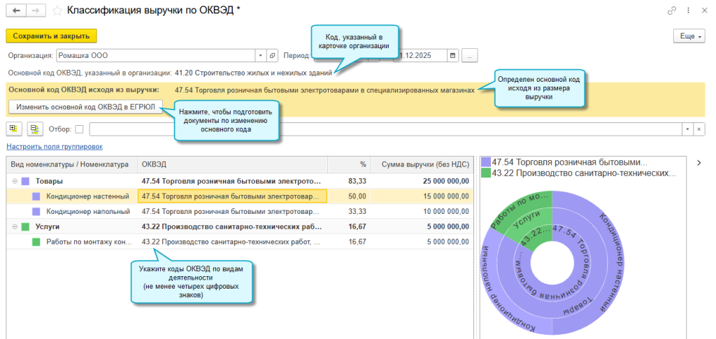 В программе «1С:Бухгалтерия 8» начиная с версии 3.0.190.2 добавлена возможность проверить основной код ОКВЭД исходя из фактической выручки организации за год.