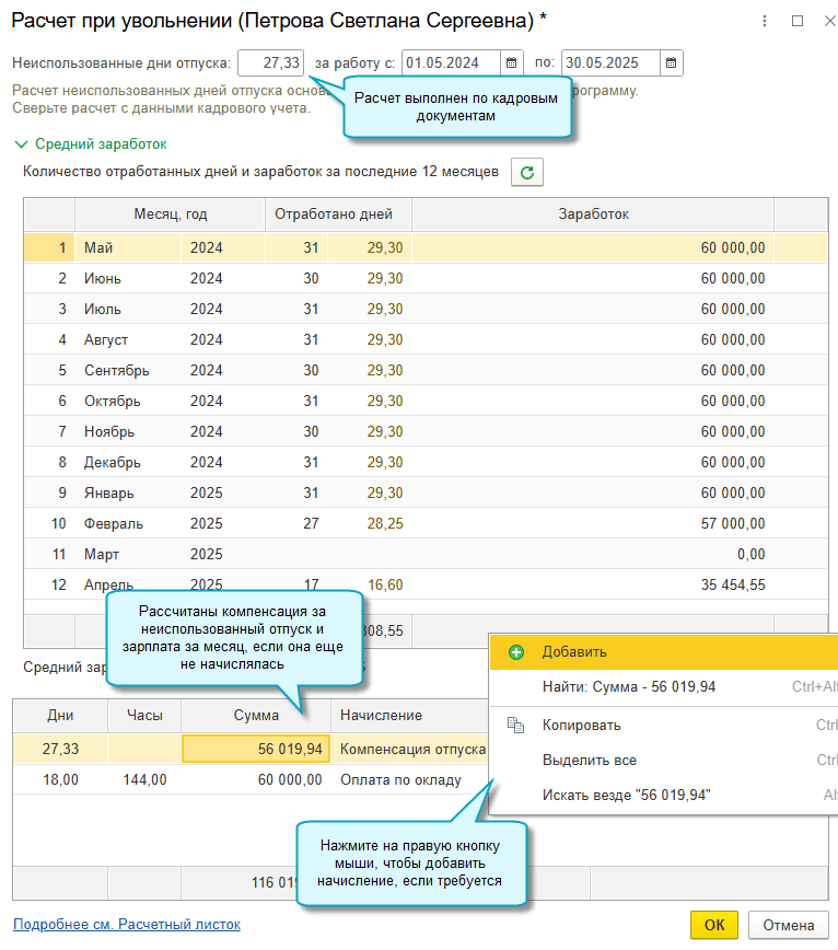 В программе «1С:Бухгалтерия 8» начиная с версии 3.0.176 теперь при увольнении сотрудника рассчитывается и начисляется компенсация за неиспользованный отпуск и зарплата за последний месяц. Для этого в документ «Увольнение» добавлен расчет компенсации и зарплаты. Кроме приказа об увольнении теперь можно распечатать еще записку-расчет при увольнении и расчет среднего заработка.