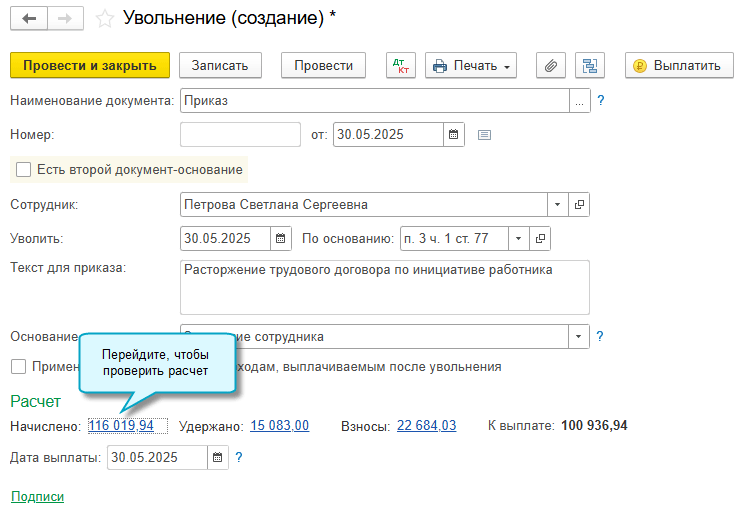 Полный интерфейс: меню «Зарплата и кадры – Кадры – Кадровые документы – Увольнение» или «Зарплата и кадры – Зарплата – Все начисления – Увольнение».