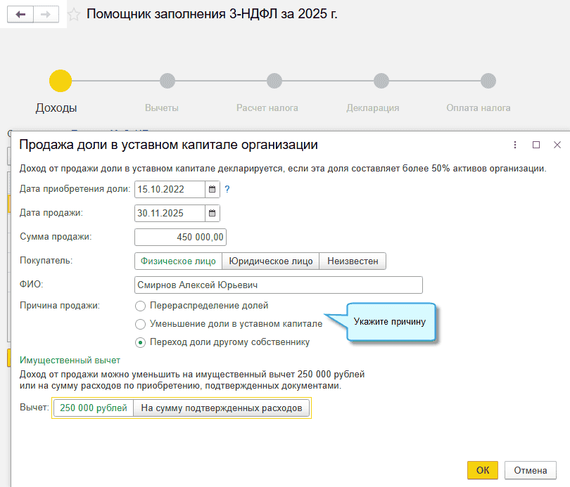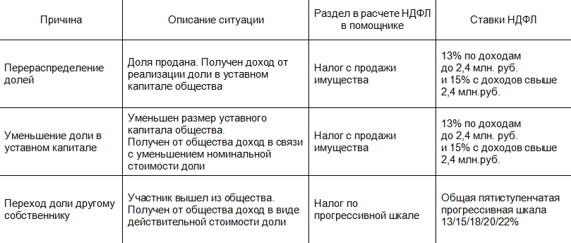 В программе «1С:Бухгалтерия 8» начиная с версии 3.0.192 поддержан расчет НДФЛ по доходам в связи с продажей и прочим выбытием доли в уставном капитале организации через помощник.