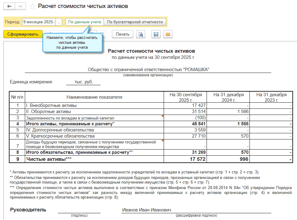 В программе «1С:Бухгалтерия 8» начиная с версии 3.0.191 добавлена возможность рассчитать стоимость чистых активов в соответствии с приказом Минфина России от 28.08.2014 № 84н в редакции от 31.03.2025.