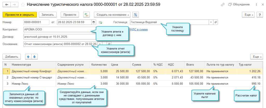 После проведения всех документов Начисление туристического налога за отчетный квартал выполните регламентную операцию Расчет туристического налога.