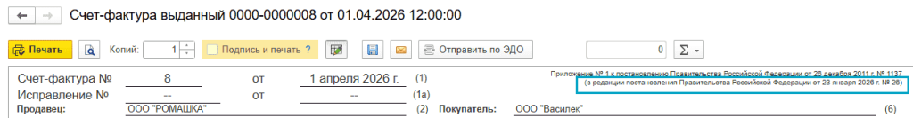В программе «1С:Бухгалтерия 8» начиная с версии 3.0.194 с 01.04.2026 применяются формы счета-фактуры, книги покупок и книги продаж, утвержденные постановлением Правительства РФ от 26.12.2011 №1137 в редакции постановления Правительства РФ от 23.01.2026 №26.