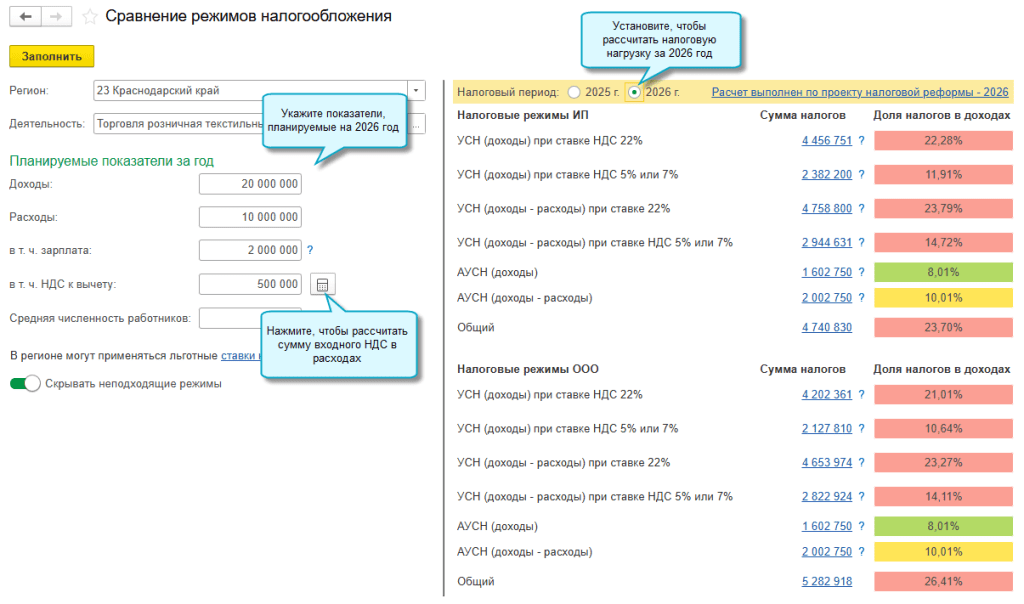 В программе «1С:Бухгалтерия 8» начиная с версии 3.0.184.26 добавлена возможность рассчитать налоговую нагрузку и выбрать подходящий налоговый режим на 2026 год с учетом изменений по проекту налоговой реформы: