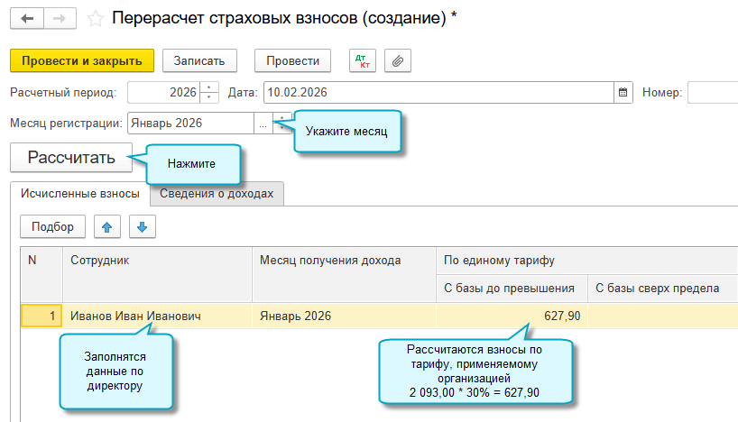 Простой интерфейс: меню «Сотрудники – Взносы и пособия – Страховые взносы – Регистрации облагаемой базы руководителя».Полный интерфейс: меню «Зарплата и кадры – Страховые взносы – Регистрации облагаемой базы руководителя».