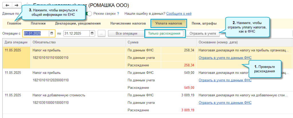 В программе «1С:Бухгалтерия 8» начиная с версии 3.0.181 теперь удобнее сверять ЕНС по данным учета и ФНС. Добавлена закладка с результатами сверки по всем разделам, из которых можно сразу перейти к анализу и устранению расхождений. При сверке сальдо отчет по операциям ЕНС по данным учета формируется на ту же дату, на которую актуальны данные в Личном кабинете ФНС.