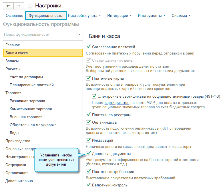 Чтобы вести учет денежных документов, потребуется выполнить следующую настройку: