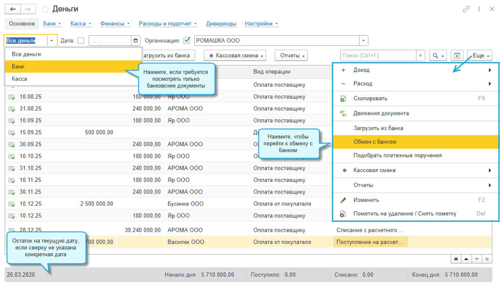 На основной странице раздела «Деньги» общий список документов теперь можно смотреть отдельно по банку и кассе на заданную дату. В подраздел «Настройки» добавлены настройки, связанные с отражением операций по банку и кассе.