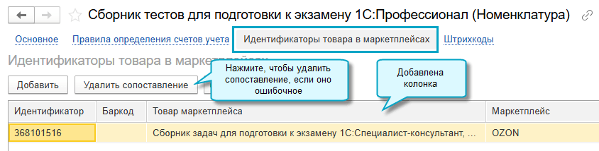 Добавлена возможность удалить сопоставление, если товар сопоставлен ошибочно. Тогда при следующей загрузке продаж или при загрузке каталога маркетплейса можно будет правильно сопоставить товар на маркетплейсе с номенклатурой в программе.
