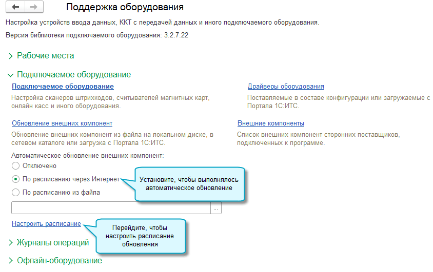 Настройте автоматическое обновление установленных драйверов по расписанию через Интернет, чтобы поддерживать в актуальном состоянии подключенное оборудование. Для коробочных (локальных) версий необходимо подключение Интернет-поддержки пользователей. Чтобы проверить работоспособность подключения, перейдите в монитор Портала 1С:ИТС