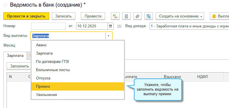 Простой интерфейс: меню «Сотрудники – Выплаты – Ведомость в банк».