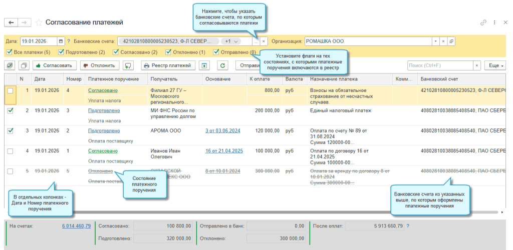 В реестр платежей теперь можно одновременно включать платежные поручения с разными состояниями: Подготовлено, Согласовано, Отклонено или Отправлено.