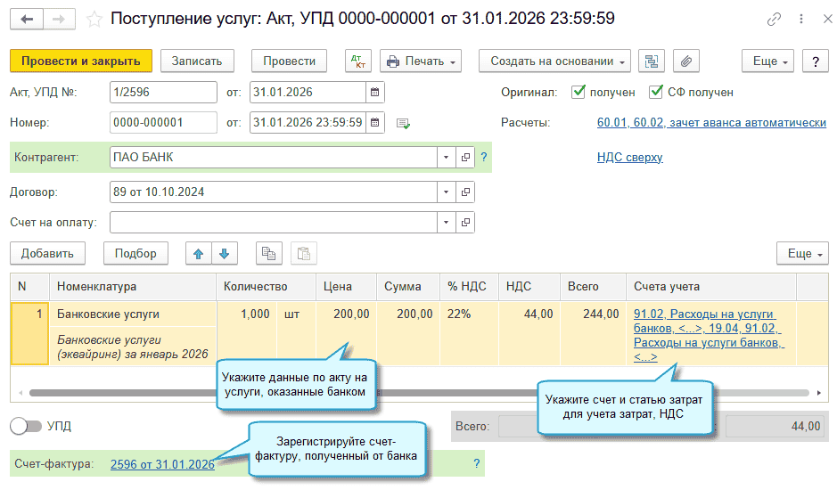 2. Комиссия банка учитывается в расходах, НДС выделяется по документу поступления услуг, в котором указан счет-фактура полученный.