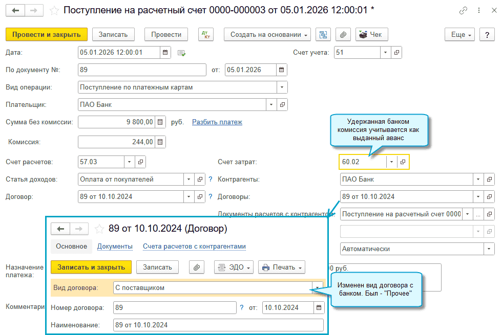 1. Удержанная банком комиссия отражается как аванс по документу поступления на расчетный счет по платежным картам.