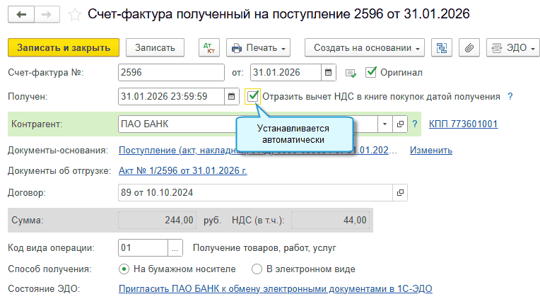 3. НДС принимается к вычету в зависимости от указанной в счет-фактуре настройки – сразу при получении счета-фактуры или при проведении регламентной операции «Формирование записей книги покупок».