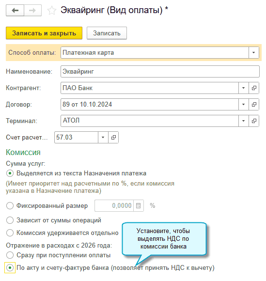Открыть настройку отражения комиссии банка с 2026 года можно также здесь: