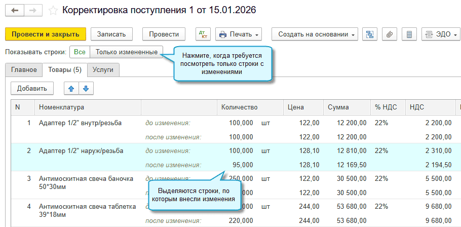 В программе «1С:Бухгалтерия 8» начиная с версии 3.0.191 теперь выделяются строки, по которым внесены изменения, в документах Корректировка поступления и Корректировка реализации.